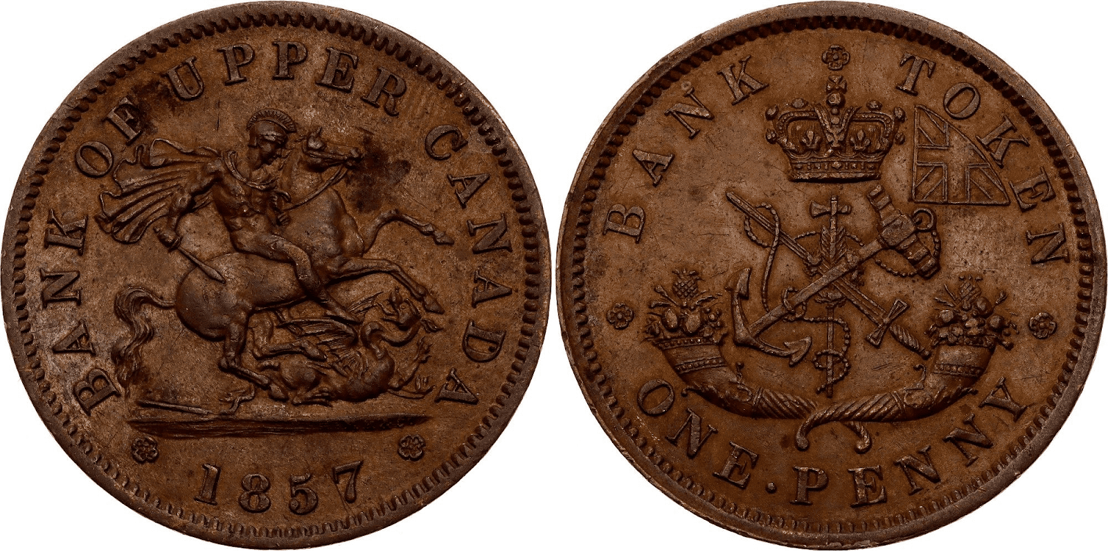 У 1849 році через заворушення в Монреалі столицю Канади було перенесено з Монреаля до Торонто. Того ж року Bank of Upper Canada було надано право карбувати мідні монети.